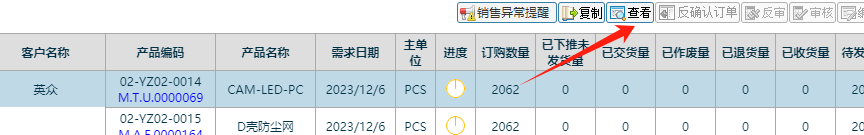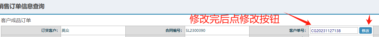然后找到要修改的订单,点中后再点击查看 如下图: 改完后客户单号后,点击修改按钮保存 如下图: