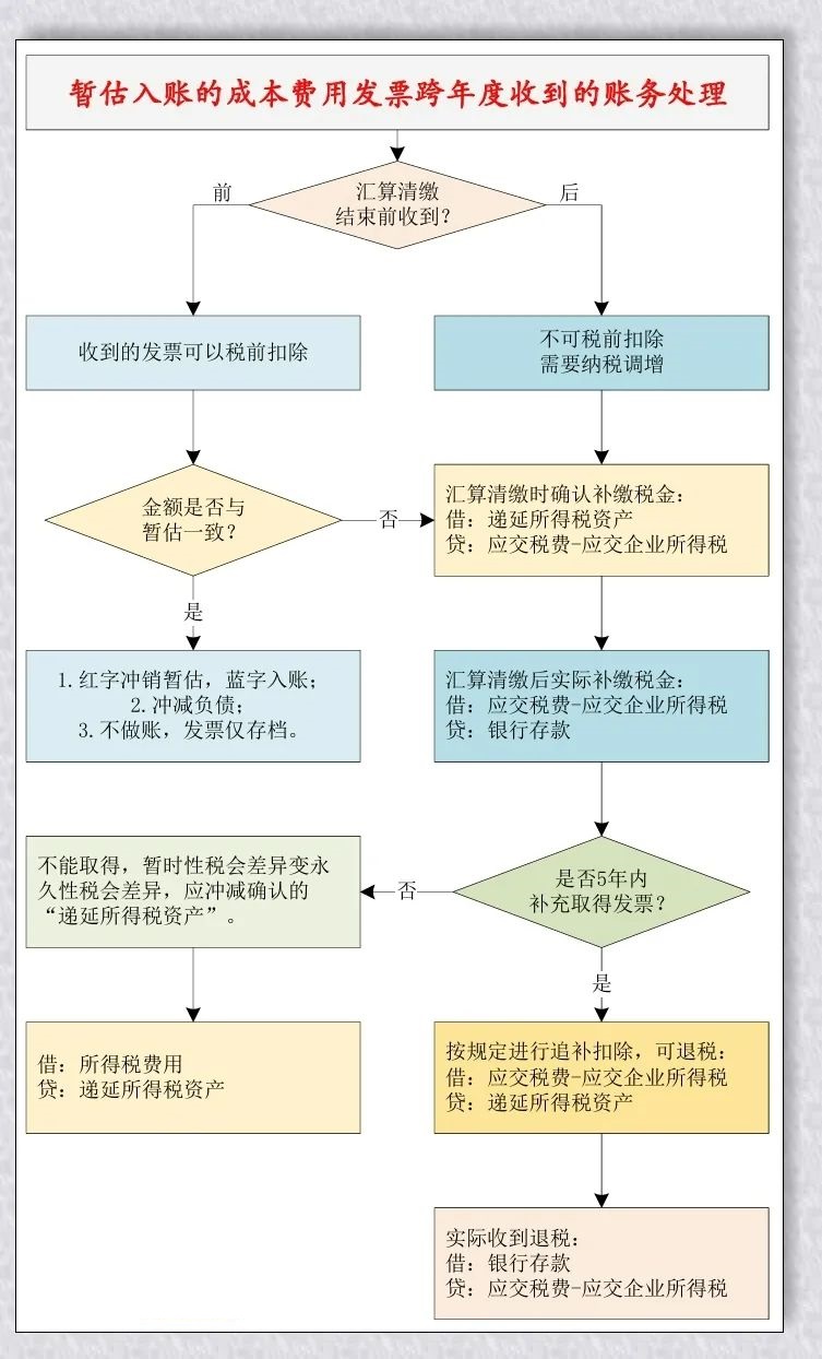 企业执行《企业会计准则》,对于实际发生但未收到发票的成本费用已经暂估入账计入了当期的损益,企业所得税按照会计核算数据进行了预缴申报,年终时按照预估汇算清缴前能收到发票进行了所得税会计处理。 跨年后实际收到发票,可能是汇算清缴结束前收到,也可能是汇算清缴结束后收到,该分别如何进行账务处理? 跨年后实际收到发票,可能与暂估金额一致,也可能不一致,不一致的差额后期可能继续收到,也可能无法收到,该分别如何进行账务处理? ![]() 暂估入账的成本费用发票跨年度后才收到,需要区分汇算清缴结束前收到和汇算清缴结束后收到。 一、汇算清缴结束前收到发票 根据具体情形的不同,分别进行不同的账务处理。 (一)红字冲销暂估,蓝字入账 【案例1】A公司为一家商贸企业,一般纳税人,2×23年12月从供应商甲公司购进一批商品,不含税价100万元,已经全部暂估入库和对外销售,确认了销售收入和销售成本。2×24年1月25日经过对账后,收到甲公司的增值税专票,并转账支付了货款113万元。 A公司2×24年1月的会计分录: 1.月初红字冲销暂估入库: 借:库存商品-xx 100万元(红字) 贷:应付账款-暂估入账 100万元(红字) 2.实际收到发票并付款: 借:库存商品-xx 100万元 贷:银行存款 113万元 (二)冲减负债 【案例2】B公司因为资金紧张,向乙公司借了一笔资金,B公司在2×23年关账时前计提了该下半年度利息1万元,计入了“财务费用”和“应付利息”科目。乙公司在2×24年1月5日开具了利息发票,B公司收到发票后转账支付了该笔利息。假定该利息可全额税前扣除。 B公司2×24年1月的会计分录: 借:应付利息 1万元 贷:银行存款 1万元 (三)无需账务处理 【案例3】C公司因为资金紧张,向某银行借了一笔资金,C公司银行账户在2×23年12月被银行直接划扣了利息10万元,C公司减少了“银行存款”并计入了“财务费用”科目。C公司在2×24年3月才收到银行开具的利息发票。假定该利息可全额税前扣除。 解析: C公司收到在上年度已经实际支付的利息发票,由于会计核算已经正确处理的,不再需要重复做账务处理,只需要将发票粘贴在利息支付的会计凭证后,或者单独存档以备检查,都是可以的。 (四)综合情况 【案例4】D公司为一家商贸企业,一般纳税人,2×23年12月从供应商丁公司购进一批商品,不含税价200万元,已经全部暂估入库和对外销售,确认了销售收入和销售成本。2×24年1月25日收到丁公司的增值税专票价税合计113万元,并转账支付了货款113万元。其余发票在汇算清缴前没有收到,纳税调增补缴了企业所得税25万元。2×24年7月25日收到丁公司的增值税专票价税合计113万元,并转账支付了货款113万元,然后按规定办理了追补扣除的专项申报,申请退还了企业所得税25万元。 D公司2×24年1月的会计分录: 1.月初红字冲销暂估入库: 借:库存商品-xx 200万元(红字) 贷:应付账款-暂估入账 200万元(红字) 说明:月末时,对于未收到发票部分,继续暂估。 2.实际收到发票并付款: 借:库存商品-xx 100万元 贷:银行存款 113万元 3.汇算期间纳税调增,确认补缴的企业所得税: 借:递延所得税资产 25万元 贷:应交税费-应交企业所得税 25万元 实际补缴企业所得税: 借:应交税费-应交企业所得税 25万元 贷:银行存款 25万元 4.实际收到发票并支付货款,与前述1月份会计分录一致,不赘述。 5.追补扣除,确认应退税额: 借:应交税费-应交企业所得税 25万元 贷:递延所得税资产 25万元 实际收到退税款: 借:银行存款 25万元 贷:应交税费-应交企业所得税 25万元 二、汇算期间结束后收到发票 在汇算清缴结束前,未收到符合规定的税前扣除凭证的,不得税前扣除,需要纳税调增;然后,在汇算清缴结束后,5年内补充取得符合规定的税前扣除凭证(包括发票),是可以按规定追补扣除。 【案例5】E公司为一家商贸企业,一般纳税人,2×23年12月从供应商丙公司购进一批商品,不含税价100万元,已经全部暂估入库和对外销售,确认了销售收入和销售成本。因为丙公司的原因,2×24年7月25日甲公司的才收到增值税专票,并转账支付了货款113万元。E公司在汇算清缴时纳税调增补缴了企业所得税25万元,然后实际收到发票后再追补扣除申请退税25万元。 E公司的会计分录: 1.月初红冲,月末重新暂估,略。 2.汇算清缴时纳税调增,确认补缴税款: 借:递延所得税资产 25万元 贷:应交税费-应交企业所得税 25万元 实际补缴税款: 借:应交税费-应交企业所得税 25万元 贷:银行存款 25万元 3.实际收到发票并付款,略。 4.追补扣除,确认退税额: 借:应交税费-应交企业所得税 25万元 贷:递延所得税资产 25万元 实际收到退税: 借:银行存款 25万元 贷:应交税费-应交企业所得税 25万元 【案例6】F公司在2×23年12月发生了厂房修缮费用,跟甲建筑公司约定留下了2万元(不含税价)作为质保金,1年后没有质量问题才予以支付,在实际支付时开具发票。该厂房修缮费用,不满足资本化,F公司全部费用化,并将质保金2万元作为应付款挂账。 F公司在2×24年办理2×23年汇算清缴时,对2万元质保金对应的费用做了纳税调增,补缴了企业所得税0.5万元。 假设2×24年质保期满,按照约定,F公司实际支付质保金并收到专票价税合计1.09万元,剩余1万元不再需要支付质保金。 F公司的会计分录: 1.汇算清缴时,纳税调增,补缴企业所得税: 借:递延所得资产 0.5万元 贷:应交税费-应交企业所得税 0.5万元 实际补缴