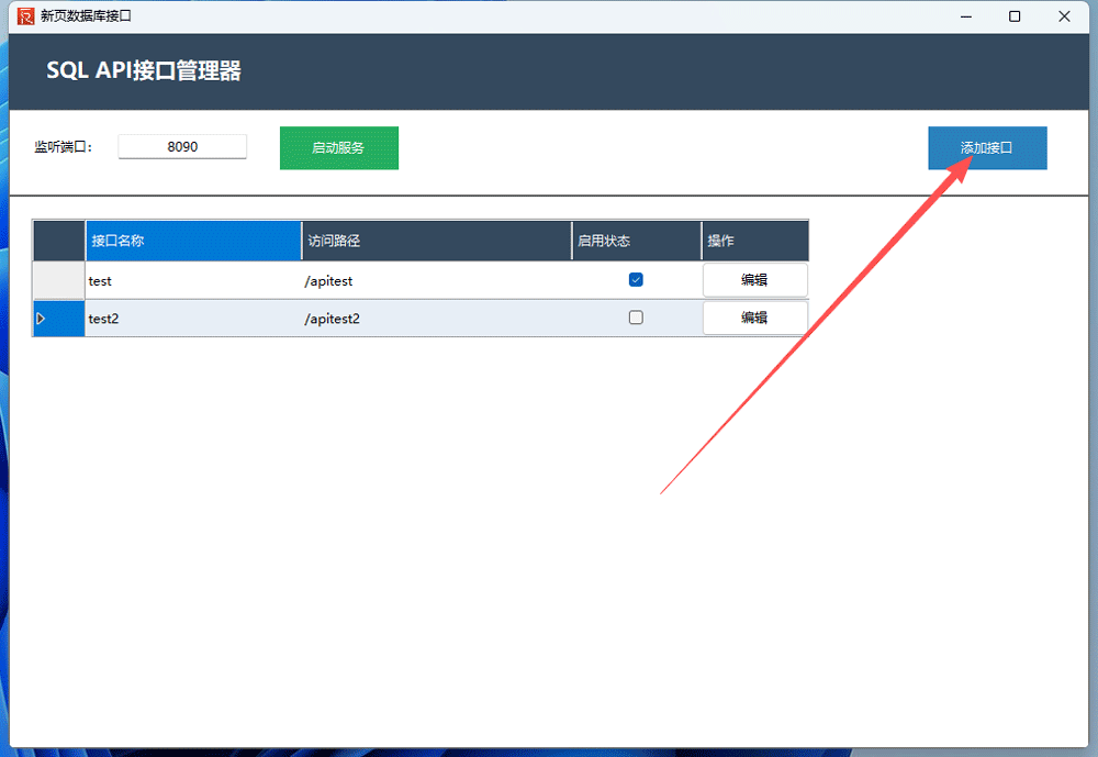 打开工具:启动 “数据库接口” 工具,进入接口配置主界面,界面将展示监听端口、启动服务、添加接口等核心功能按钮,同时显示已配置接口的名称、访问路径、启用状态及编辑操作项。