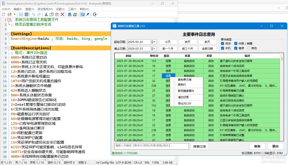 4. 配置文件支持:首次运行自动生成 INI,可自定义事件ID描述和搜索引擎。