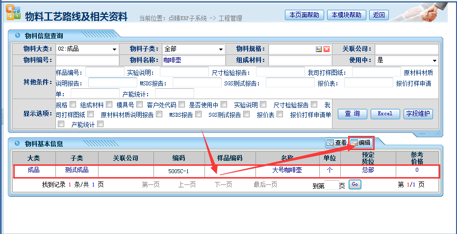选中成品明细,点击“编辑”按钮;进入如下图页面: